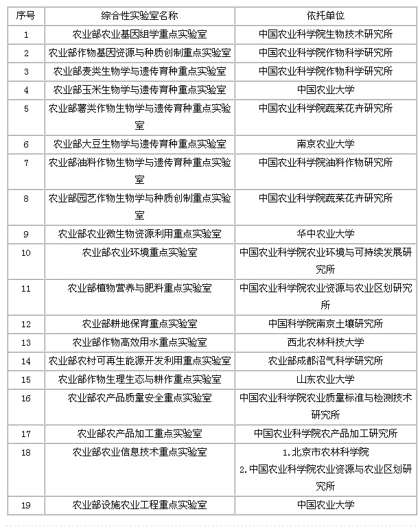 農業(yè)部重點實驗室建設(第二批)依托單位名單公示